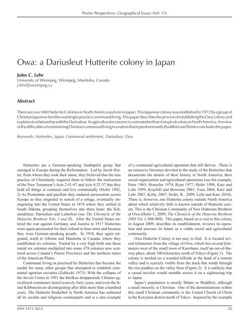Owa A Dariusleut Hutterite Colony In Japan Pcag University Of